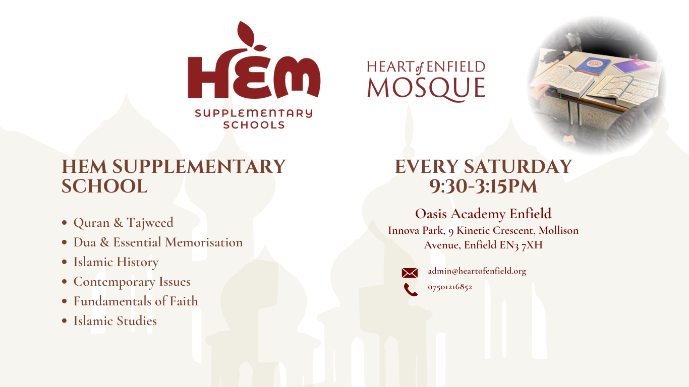 HEM supplementary school provides a local facility for children aged 5-16 to learn the fundamental values of their Islamic faith.